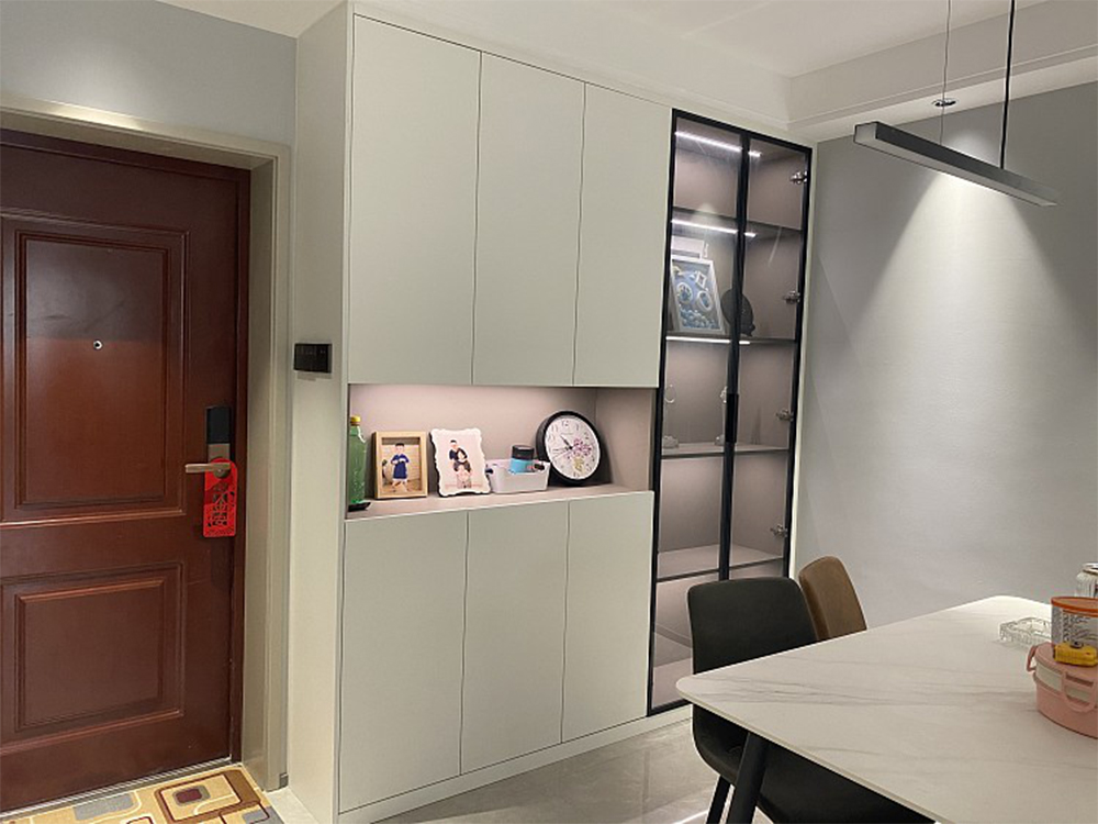 進(jìn)門是餐廳,所以設(shè)計(jì)師將入戶玄關(guān)柜和酒柜合二為一,多功能的柜子采用一柜到頂?shù)臉邮?,?shí)木乳白玄關(guān)柜可以在落地柜存放鞋子和雜物,在上層的柜子里還可以收納餐具,作為餐邊柜。中間鏤空的柜面可以擺放相冊(cè)等裝飾品,或者擺放日常用品。