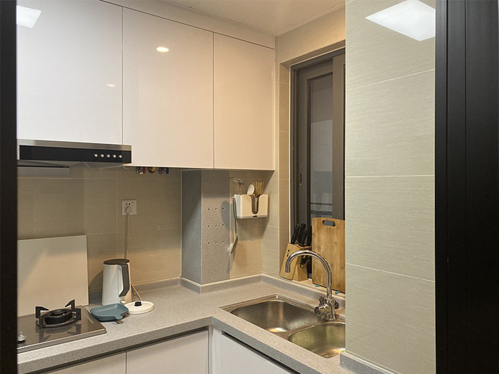 C字型廚房占整個(gè)房屋面積很小,但是五臟俱全。上下柜體都可以收納,大理石臺(tái)面方便清理。