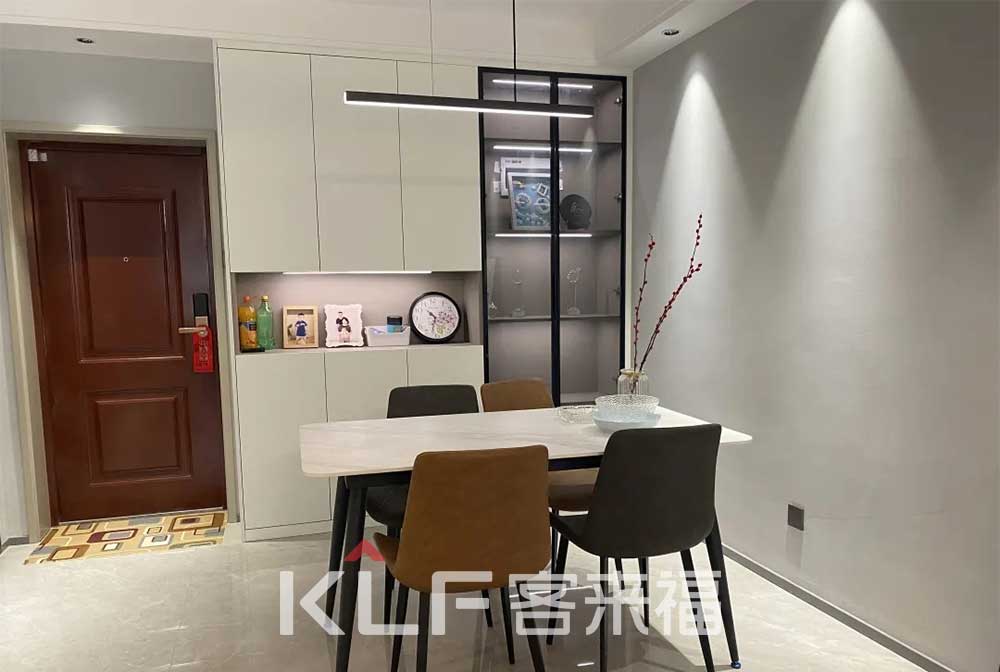 入戶即是餐廳,餐廳旁就是廚房,拉近家居生活動(dòng)線。透明門板餐邊柜高端大氣,不僅可以擺放裝飾品,也可以存放酒水飲料。