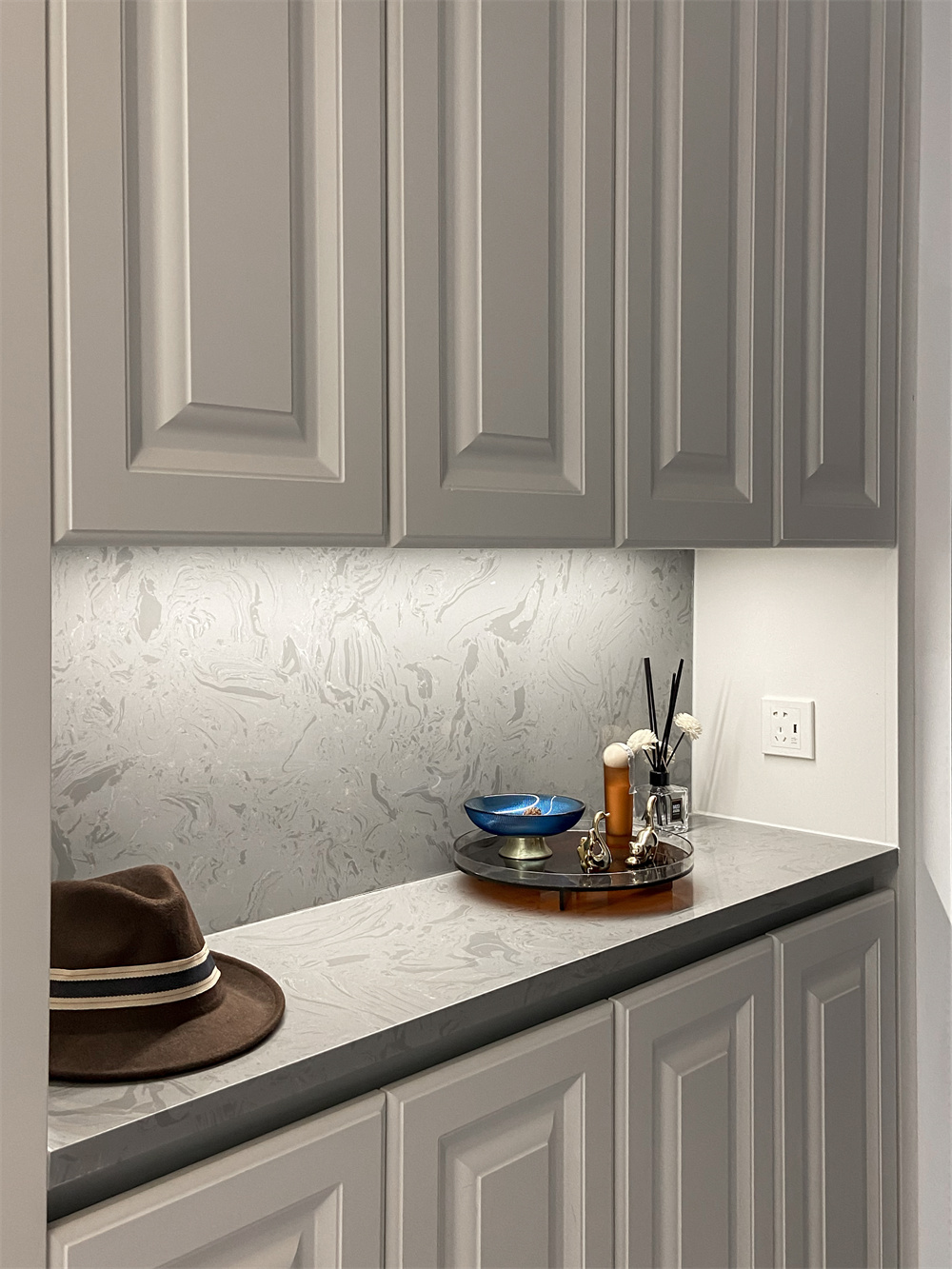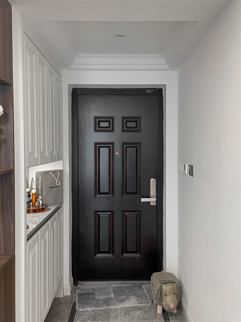 定制的整面到頂的玄關柜,芬蘭白的顏色頗為典雅,中部的空余部分可以放置鑰匙包等生活物品,在到頂鞋柜的底部同樣留出一排空間,放一些常換的拖鞋,掃地機器人也能進去清掃,衛(wèi)生無死角。玄關的柜子都做了無拉手設計,相對比較整潔。擺放一些精致的小飾物,體現(xiàn)出屋主優(yōu)雅的品味。