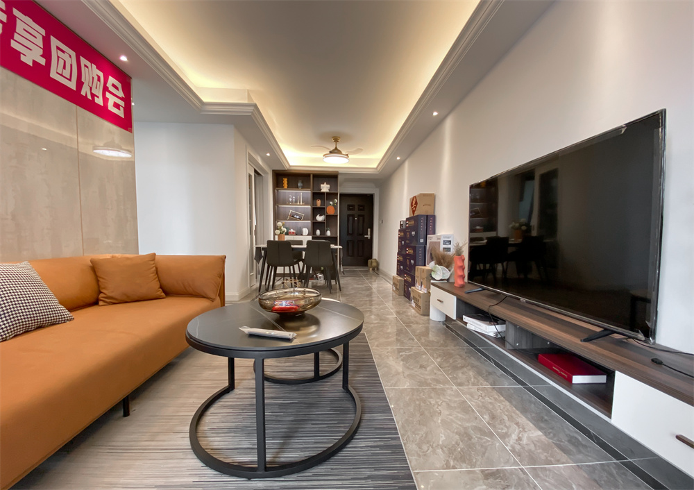 客廳的整體顏色呈中性暖色調,即便是簡單的裝修中也能透露出家的溫暖。因為客廳的整體氛圍偏向于安靜沉穩(wěn),所以精心選擇的橙色沙發(fā),于色彩上增加跳脫感,造型簡潔,線條流暢的家具組合搭配,營造出穩(wěn)定、協(xié)調、溫馨的空間感受,滿足現(xiàn)代年輕家庭的輕奢需求。