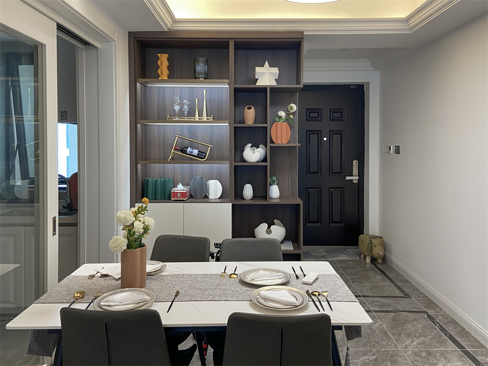 整排的餐邊柜收納柜,讓功能性大大加強,平常的餐具、藏酒都可以妥妥的安排下,開放的柜子作為展示,也可以放置一些常看的書和裝飾擺件。餐桌上擺放花束讓吃飯多了一絲溫馨,餐邊柜的不規(guī)則設計柜層,不僅滿足不同高度物品收納的需要,使整體更加具有層次感。
