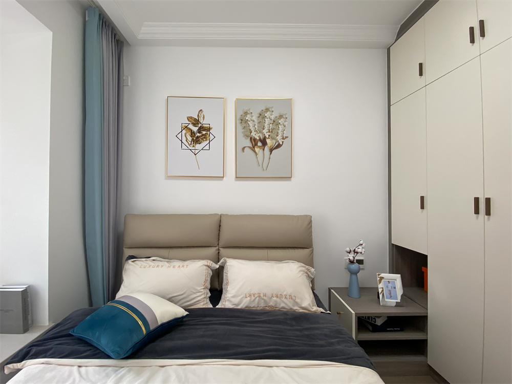 白色床單和灰色床頭的顏色搭配,整體更加輕松簡潔。芬蘭白整面衣柜為衣物收納提供好住處,側面板可以打開內置長方形小鏡子,梳妝完成后可以通過鏡子看一看今天的氣色,感受不一般的心情。