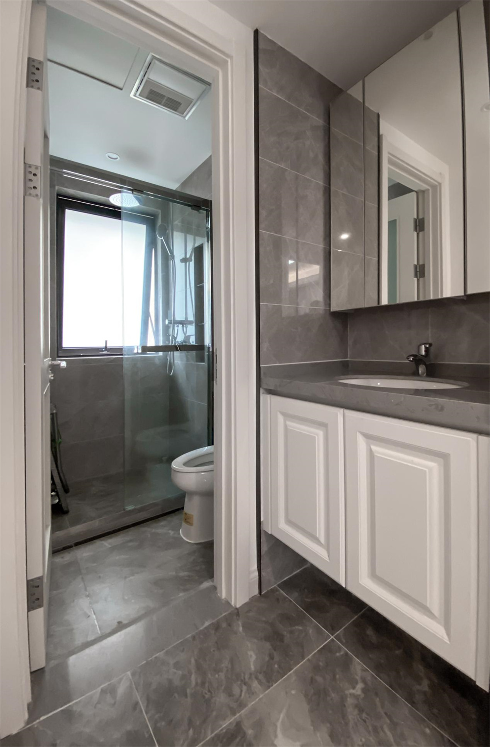 衛(wèi)生間做了干濕分離,大面積的鏡柜提供更多收納的同時,也擴展了空間視覺感,柜下的燈帶還能給面部照明提供額外的光線輔助。