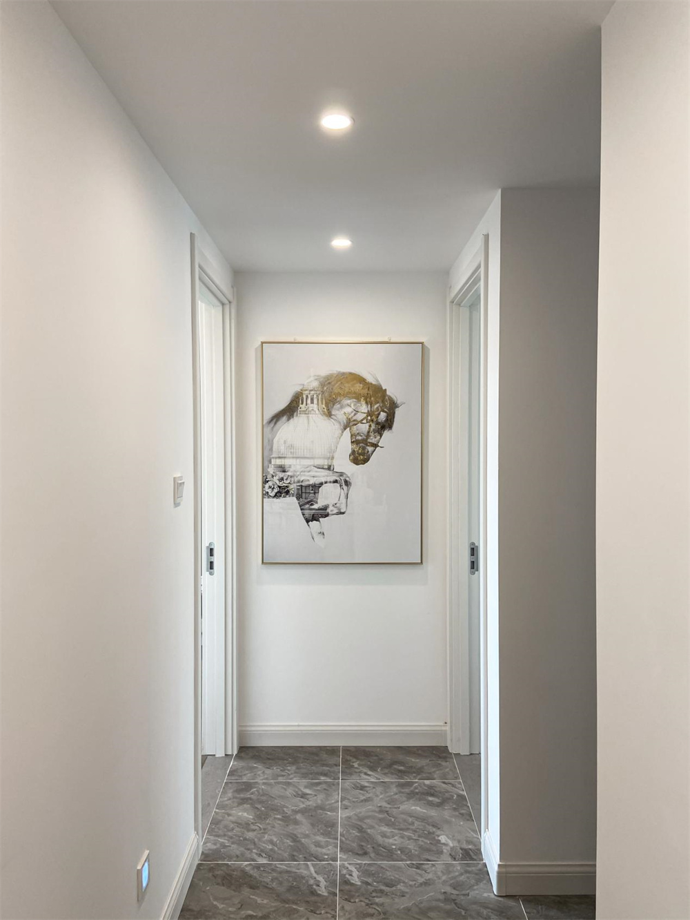 對于走廊空間較小的房屋,建議在走廊兩側放置一些精美的掛畫,可以根據自己的喜好選擇,白色的墻面略顯的有些空蕩,這樣可以增加空間內的豐富感。