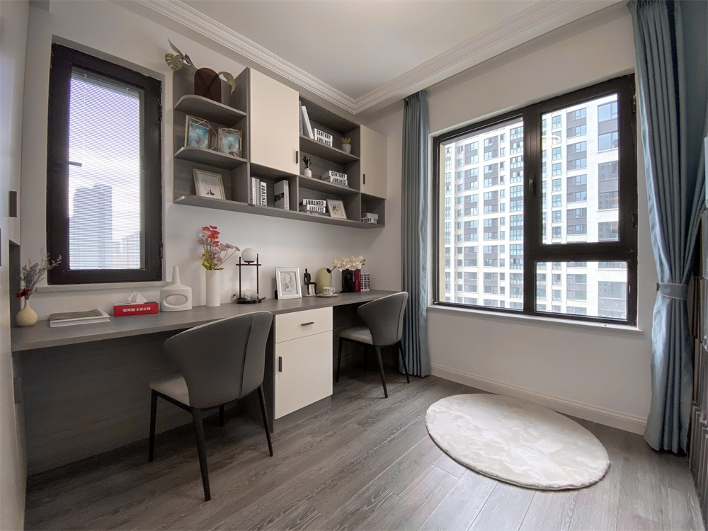 先是整面的柜子,然后與柜體相連接的書桌。吊柜采用灰橡木紋加芬蘭白的顏色搭配,從板材中透露出時光的內涵。書桌的長度兩個人一起辦公、聽音樂、品茶都是不錯的選擇,在工作之余放松自己也不失為一種享受。