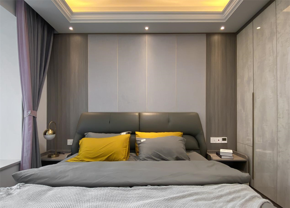 主臥整體延續(xù)輕奢的風格,以黑白灰襯底。背景板用的是灰白兩色護墻板,呈現(xiàn)簡約干練的特質。墻面未著任何的點綴,卻也不顯得空曠突兀。以灰色為主調的舒適床品,加以穿插其間的黃色調,在床頭射燈的氛圍烘托下,時尚又不失溫馨感。