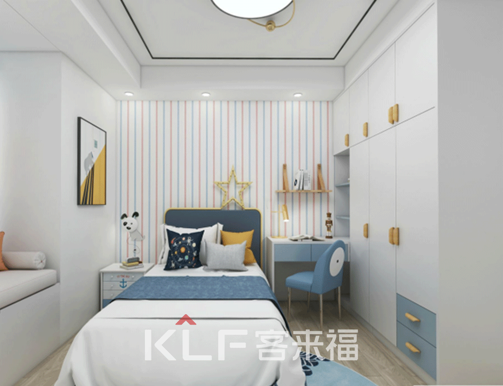 看完客廳往更深處來(lái)就是夫妻二人的主臥,以及兒童房了。主臥中冷色調(diào)以及暖色調(diào)的搭配,使得房間看起來(lái)更加溫馨,因?yàn)榉块g內(nèi)有一個(gè)大轉(zhuǎn)角,所以我們用整體式衣柜設(shè)計(jì),將這個(gè)轉(zhuǎn)角藏了起來(lái)。但也因禍得福,讓房間更具有空間的美感,同時(shí)還增加了收納空間。兒童房的設(shè)計(jì)采用了簡(jiǎn)潔的童話風(fēng),讓房間內(nèi)的色彩更加豐富,活潑鮮艷。