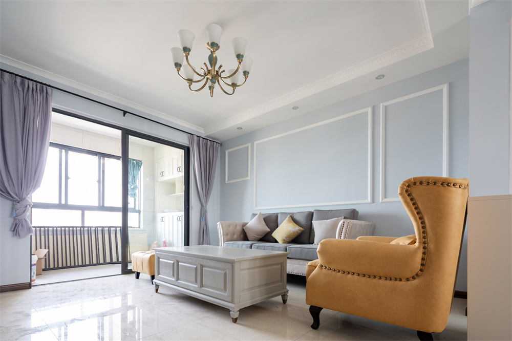 客廳處能夠真正體現(xiàn)出北歐風(fēng)情。以藍(lán)白為主要色調(diào),搭配白色吊燈,在燈光與顏色的搭配下凸顯溫馨的感覺。沙發(fā)背景墻上帶有三個(gè)不同大小的長方形的圖案,為客廳處增加生機(jī)活力。橘黃色沙發(fā)為客廳處增添一抹亮色,可以很好調(diào)節(jié)客廳內(nèi)的氛圍。