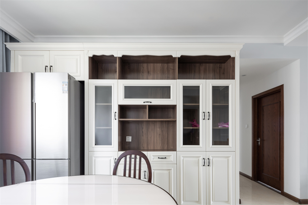 收納柜的頂部做了延長設(shè)計(jì),便于冰箱的嵌入式擺放,可以節(jié)省冰箱占據(jù)的空間。白色柜身與中雅胡桃色里面的相互搭配,透露出一股靜謐典雅的感覺。柜身按照不同擺放需求,頂部可以放置許久不用的東西,中間部分放置杯子、書本這種日常隨手可以用的物品,下方可以放置一些榨汁機(jī)、暖瓶、燒水壺等物品。