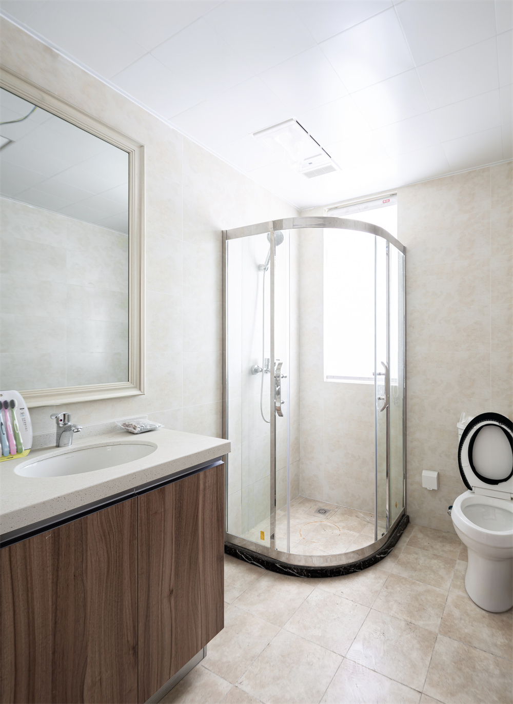 衛(wèi)浴處水池面盆和洗浴間的設(shè)計(jì)是干濕分離做法的典范,首先洗浴間做了半包的設(shè)計(jì),抬腳線高度足夠的高可避免水的漫出,在洗澡之后便可以打開窗戶進(jìn)行通風(fēng)散氣。與水池連接的柜體下面留出一些距離,便于日常水汽的散發(fā),且在衛(wèi)浴間內(nèi)沒有多于物品的阻擋,可及時(shí)保持墻面和地面的干燥。