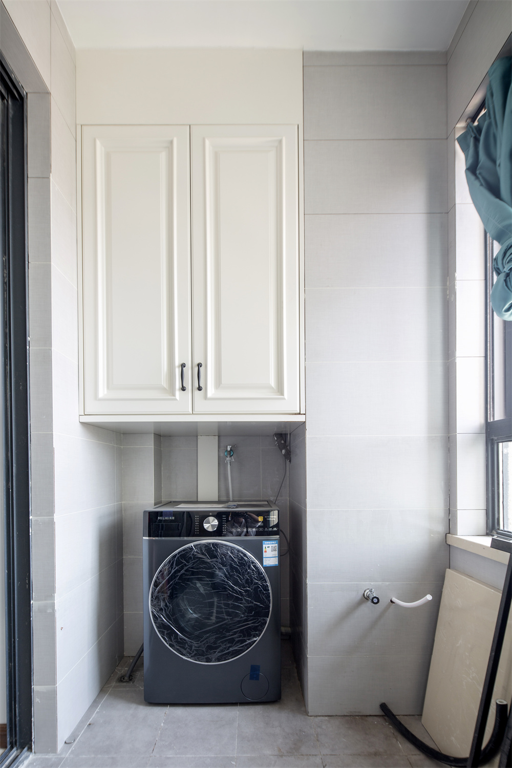 朝南的陽臺(tái)可以在太陽升起時(shí),感受來自清晨的第一縷陽光,芬蘭白整面到頂陽臺(tái)柜的設(shè)計(jì),可以放置衣架以及冬天的鞋子。中間鏤空部分加做了三個(gè)空格,給收納增加了額外的空間。
