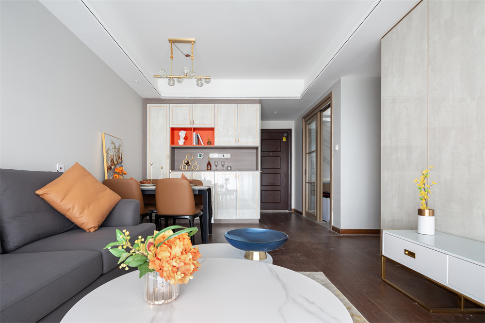 餐廳處的風(fēng)格秉承了輕奢風(fēng)格的特點(diǎn),設(shè)計師采用橘色、金色、芬藍(lán)構(gòu)成了餐廳的主色調(diào)。正面到頂?shù)牟瓦吂衽c墻面無縫銜接,通過餐邊柜上的擺件便可看出屋主的品味。裝飾物的點(diǎn)綴讓餐邊柜獨(dú)具魅力,金屬酒瓶的架子,對于日常喜歡小酌一口的家庭來說十分合適,如果再安裝酒柜的話空間不夠,餐邊柜的功能相比酒柜更加實(shí)用。