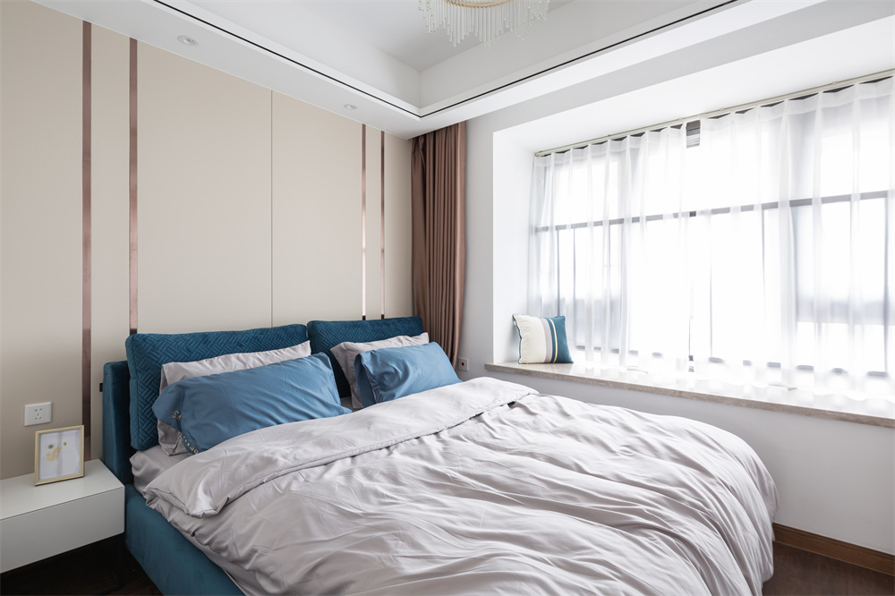 次臥平常是用來平時招待客人或者父母來時住的房間,枕頭選擇了傳統(tǒng)的藍(lán)加白的設(shè)計,如天空一般清爽自在。半開門式衣柜將兩塊柜門的之間的距離按照合適比例設(shè)計,避免門板出現(xiàn)碰撞的情況。