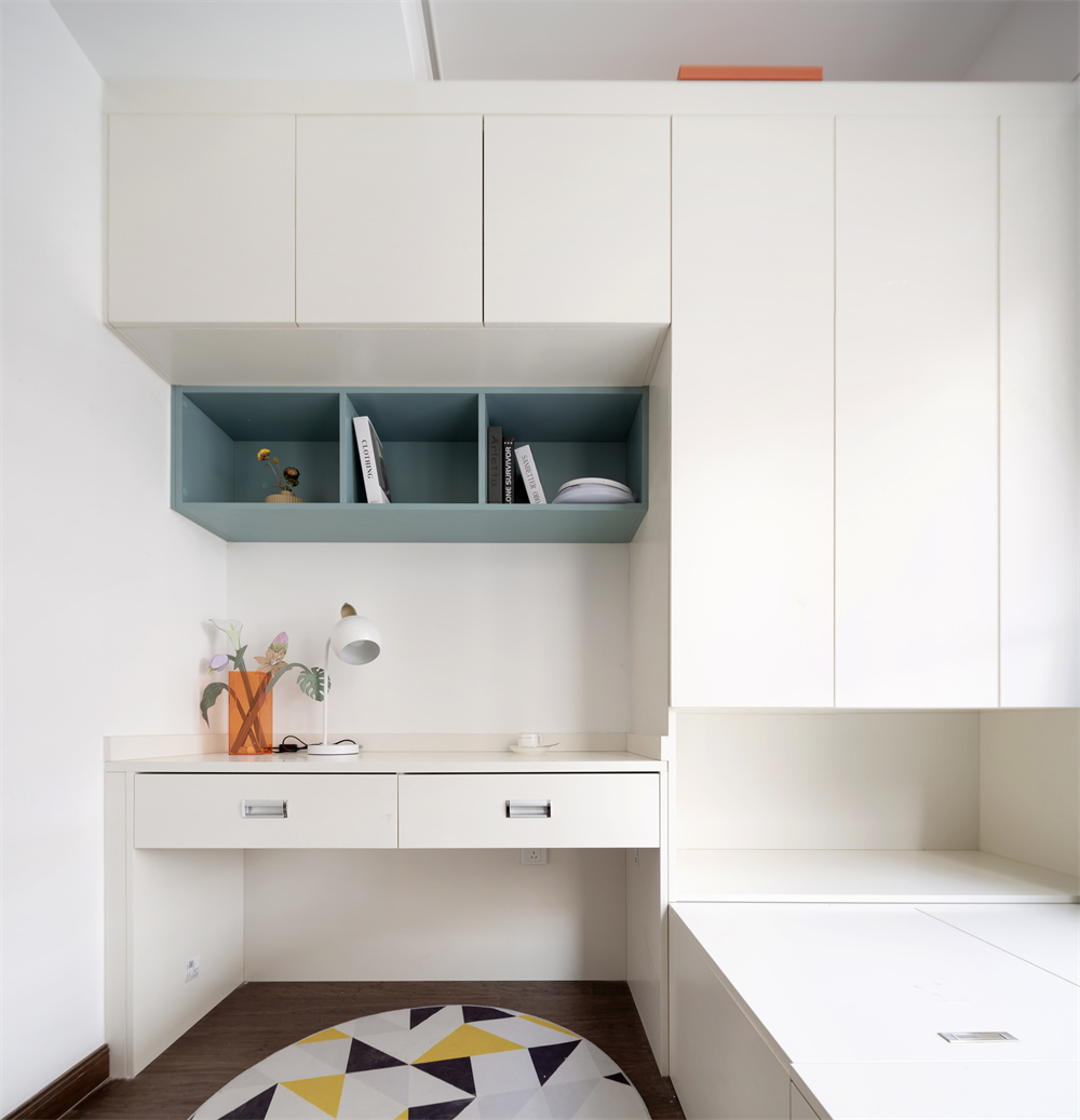 采用了書桌和榻榻米相結(jié)合的形式。抽屜中間留出把手的位置,具有自動吸附功能。幾何圖案的地毯增添了房間內(nèi)的俏皮感。