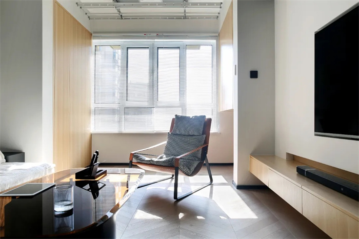 以白、灰、原木為主要色系,搭配千鳥格紋和愛馬仕橙,賦予整個(gè)空間復(fù)古簡約的濃郁氣息,從客廳透過的陽光,透過百葉窗劃分為細(xì)碎的觀影投射在木地板上,格外閃亮。