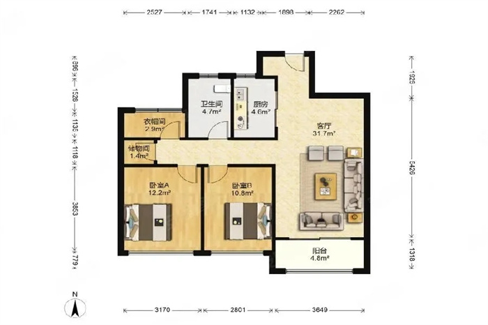 這套兩居室的戶型簡單來說便是凸字型的房屋空間結(jié)構(gòu),戶主想要增加客廳的面積,將陽臺(tái)打通,于是客廳處總共面積為35.9㎡,在主臥處的儲(chǔ)物間和衣帽間也將兩者打通,主臥的面積為16.5㎡,滿足了日?;镜纳钚枨?。