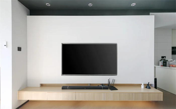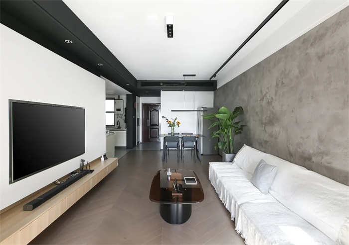 電視背景墻沒有做整面的內(nèi)嵌式的電視柜,考慮到客廳內(nèi)的整體面積和空間展示,以整面的大白墻打底更符合極簡主義的特點(diǎn),在電視柜的內(nèi)部安裝了燈帶,夜晚看電視的時(shí)候也能多一份溫馨。