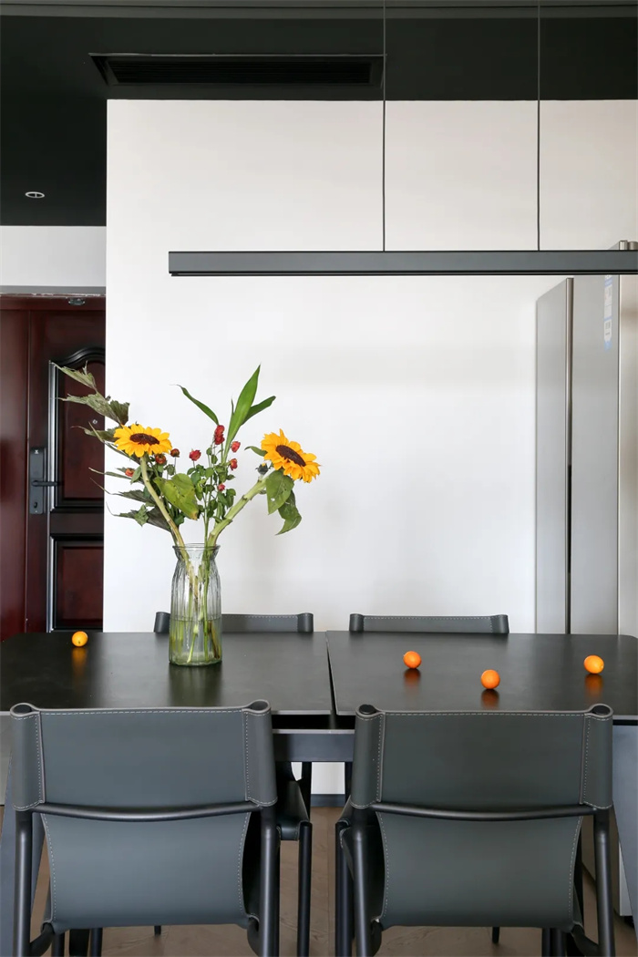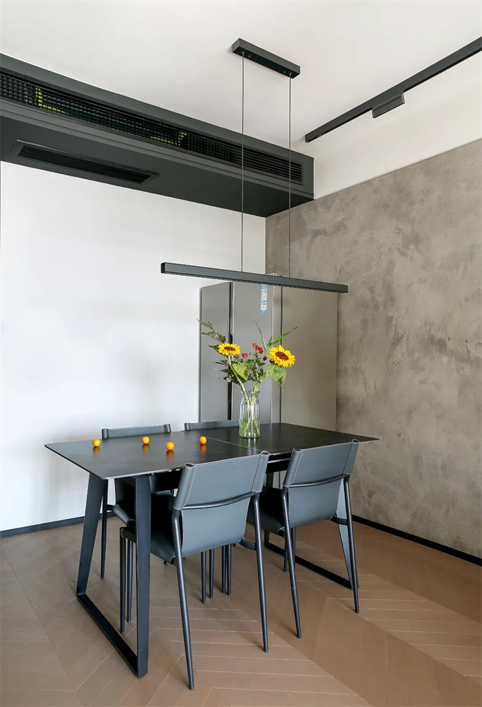 水泥灰的餐桌透露出滿滿的工業(yè)風(fēng)設(shè)計(jì),桌上擺放新鮮的花束,業(yè)主時(shí)不時(shí)會(huì)購買新鮮的花束擺放在餐桌上,展現(xiàn)出對美好生活的精準(zhǔn)向往。