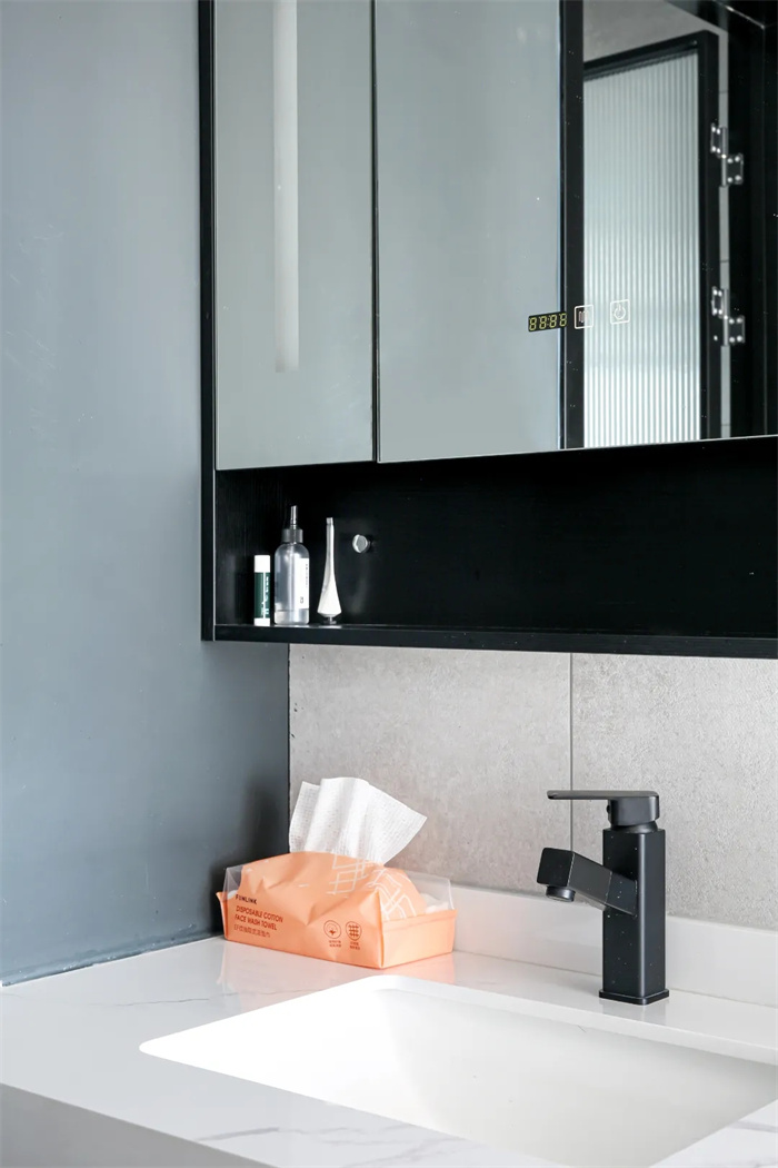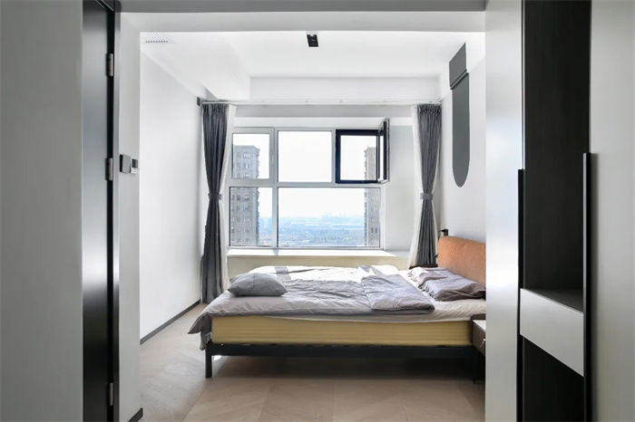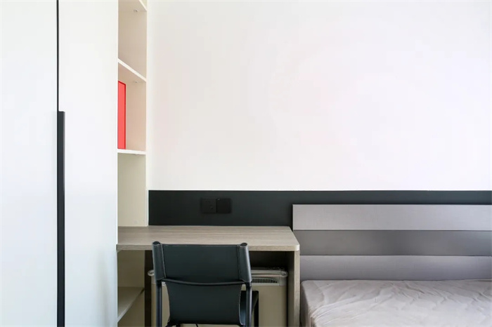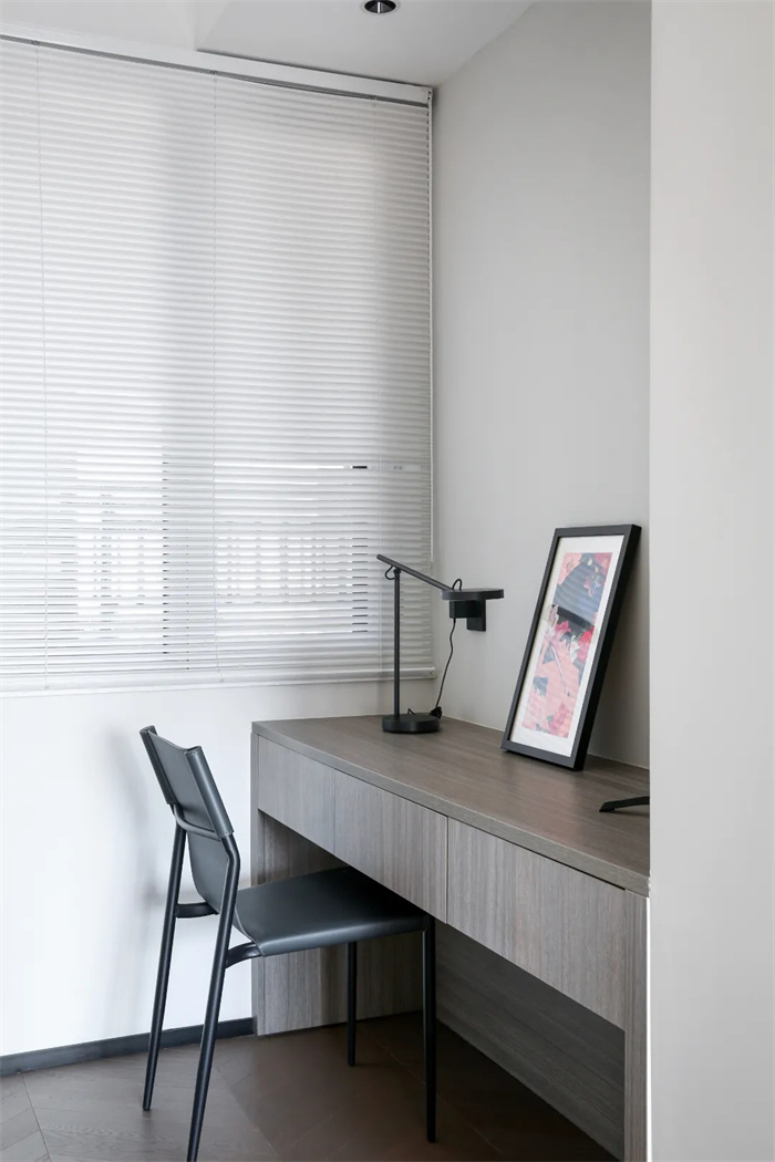 次臥同樣是采用整面到頂?shù)囊鹿?,搭配黑色的長條把手,靠墻的一側(cè)打造成開放收納格的設(shè)計(jì),延伸的桌面下方放了暖風(fēng)機(jī)等設(shè)備,次臥格局雖不大,勝在簡約。