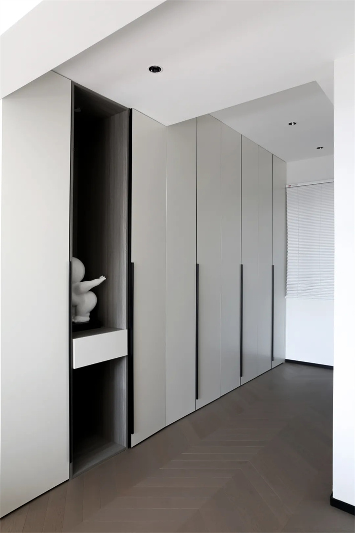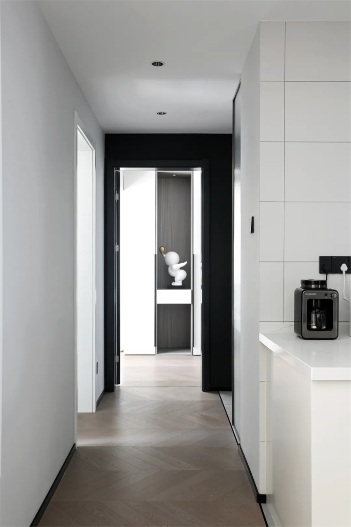 走廊空間可容納兩人并排過,映入眼簾的便是拼接的魚骨紋地板,規(guī)律的拼接產(chǎn)生一種美感。直對著臥室內(nèi)的裝飾擺件,生動(dòng)且有趣。