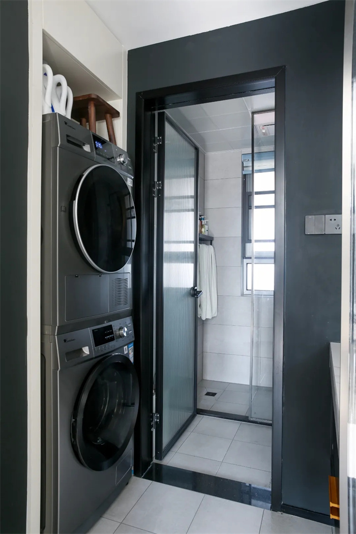由于在陽臺(tái)處安裝了柜體,并且留出一塊區(qū)域作為狗狗的休息區(qū),因此衣物洗滌和烘干的區(qū)域移到了衛(wèi)浴間。如果陽臺(tái)沒有晾曬衣物的需要,日常使用烘干機(jī)可以作為替代。
