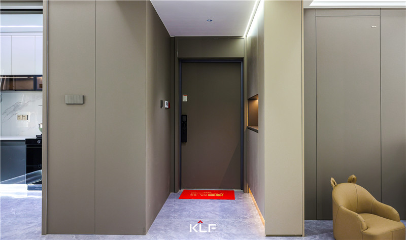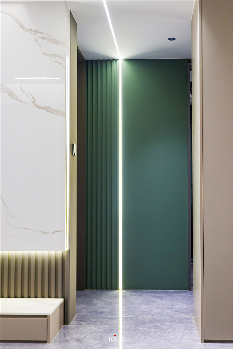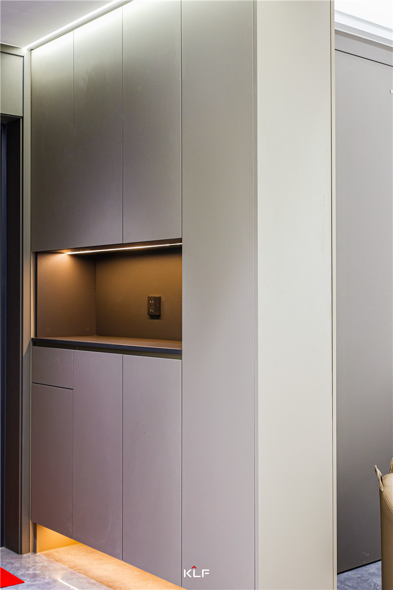 原始戶型中入戶處沒有較寬裕的空間,在設(shè)計(jì)師和屋主的溝通下定制了這樣一組收納鞋柜,簡(jiǎn)潔的造型往往更實(shí)用,無把手設(shè)計(jì)有效規(guī)避有限空間造成的磕碰,柜面整體平整度高。
