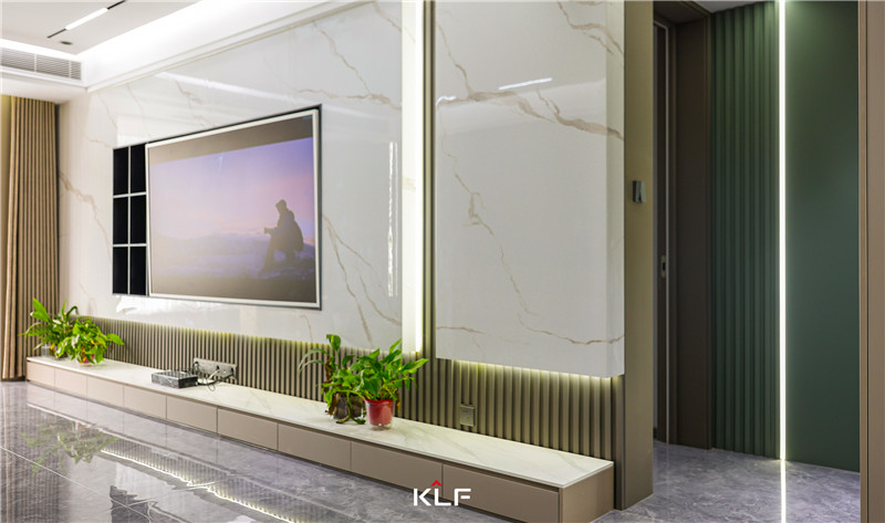 客廳主要采用灰色調(diào)裝點(diǎn)空間,電視背景墻采用大理石與木質(zhì)格柵護(hù)墻板結(jié)合,豐富家居層次感的同時(shí)讓不同材質(zhì)進(jìn)行混搭,讓石材的“冷感”中和全屋木作家居的“暖”意,達(dá)成視覺平衡。