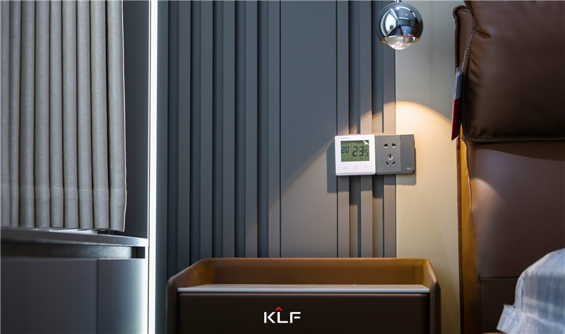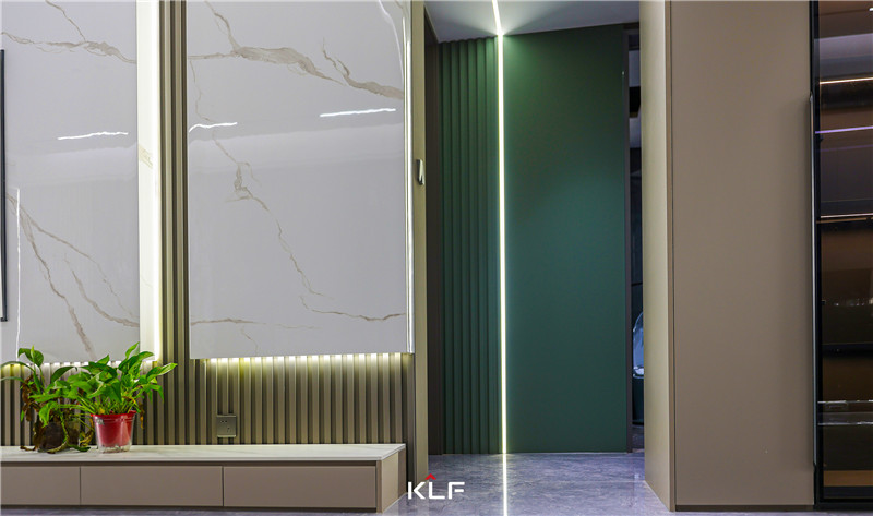 例如在過道處的格柵護(hù)墻板采用了客來?!け逃竦念伾逍伦匀?,凸顯質(zhì)感。而在臥室中則采用了更為深沉的灰色系不規(guī)則格柵墻板,營造平靜高級(jí)的家居氛圍。