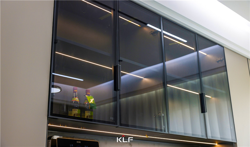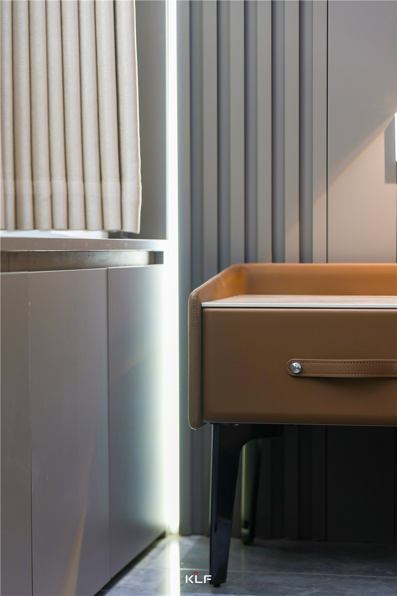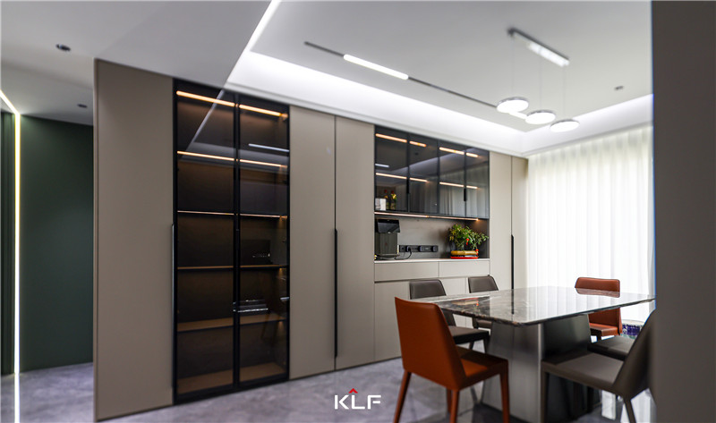 在柜體設(shè)計(jì)上想要傳遞出輕奢理念,除了暗藏?zé)魩У某R?guī)操作,可以在色彩搭配上與材質(zhì)上入手。例如案例中多處采用半透茶色彩玻作為柜門點(diǎn)綴使用,既增添了空間的通透感呼吸感,也讓整體帶有“都市輕奢”的意蘊(yùn)。