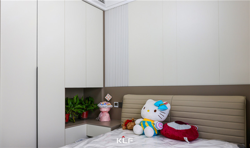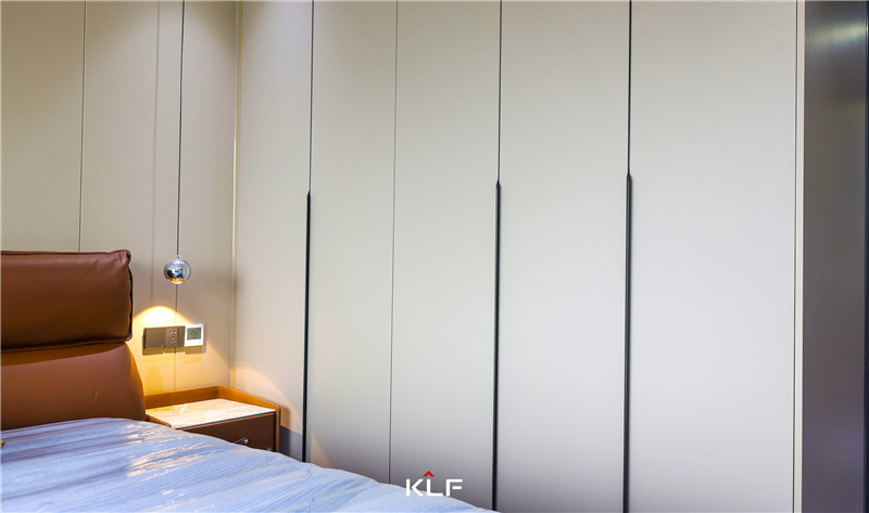 將格柵作為空間肌理進(jìn)行使用,與拉槽墻板一同設(shè)計(jì),實(shí)現(xiàn)門墻柜同色,豐富平面讓整體空間從視覺上更統(tǒng)一美觀。臥室衣柜依據(jù)墻壁走勢(shì)定制,根據(jù)不同衣物收納需求設(shè)計(jì)分區(qū),讓衣柜更懂人居。