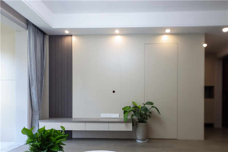電視柜一側(cè)做了隱形門,讓屋內(nèi)的兒童房更加隔音,更具私密性。墻板沒有沿用平板的造型而是在一側(cè)做了格柵,偶然的跳脫豐富了整體的設計,門墻柜一體化的設計也從視覺上讓空間看起來更干凈,顯大又高級。