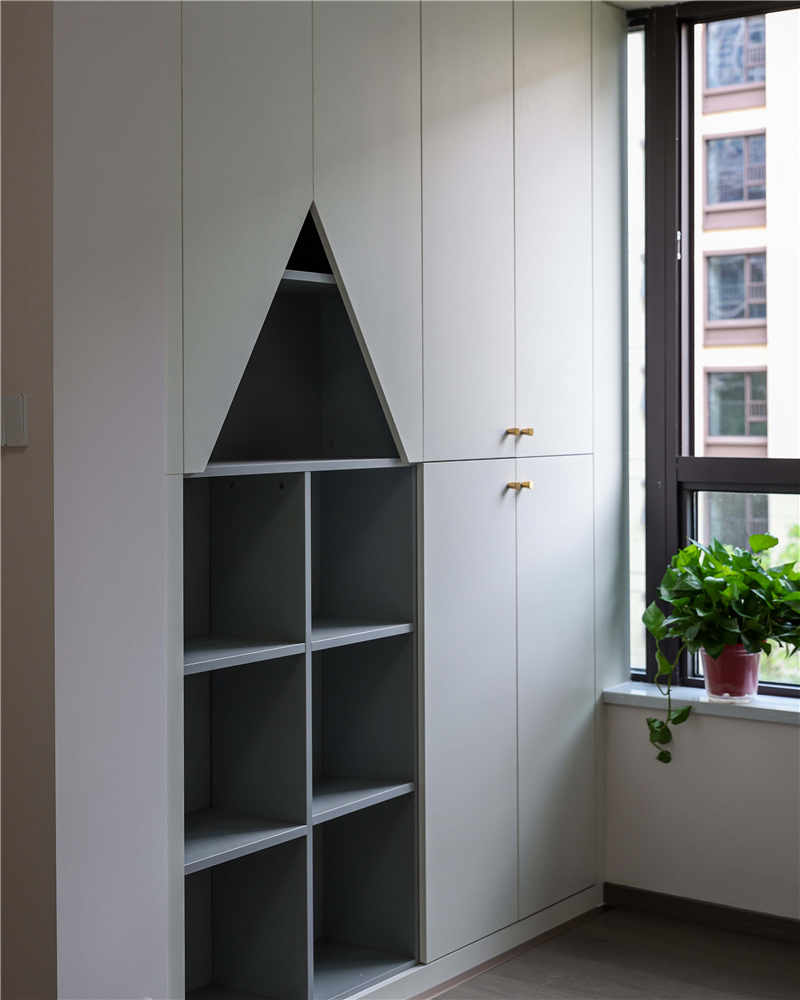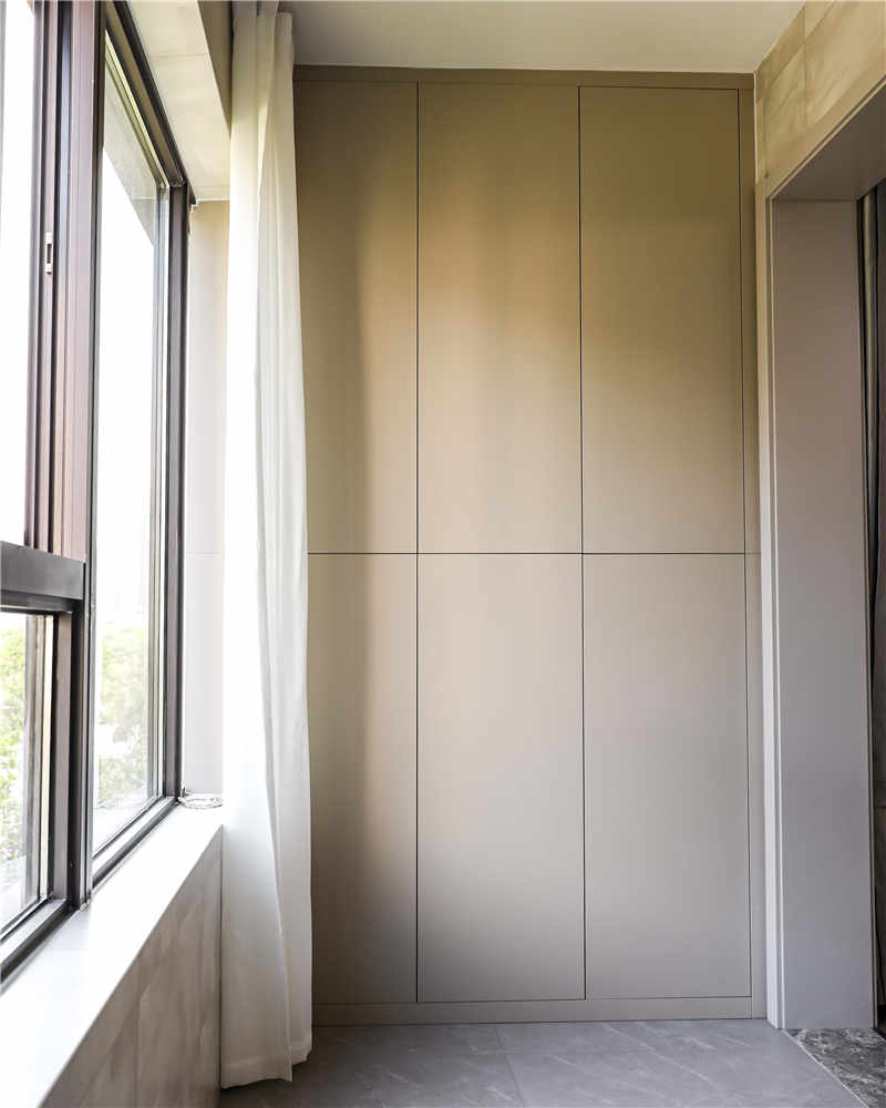 陽臺與客廳不做隔斷,在兩側(cè)分別定制了到頂?shù)恼骊柵_柜,外表簡樸低調(diào),實則內(nèi)涵欠款,不同尺寸的收納格可以用于收納衛(wèi)生物品和日常清潔的工具,很實用!