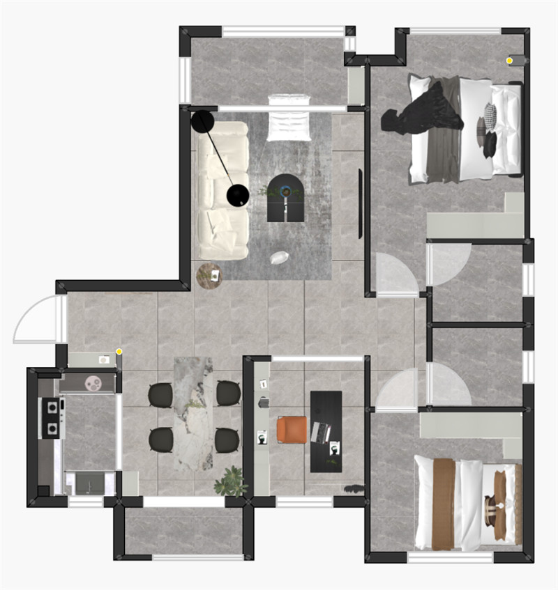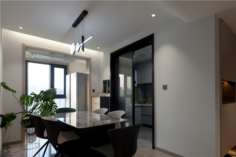 有室有食,簡單幸福。堅(jiān)守功能主義的理念,以結(jié)構(gòu)為入眼點(diǎn)布局色彩、設(shè)計(jì),使得動線明晰;蘭迪灰門板與黑色調(diào)的中和,簡約又不失大氣感。