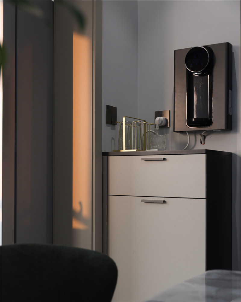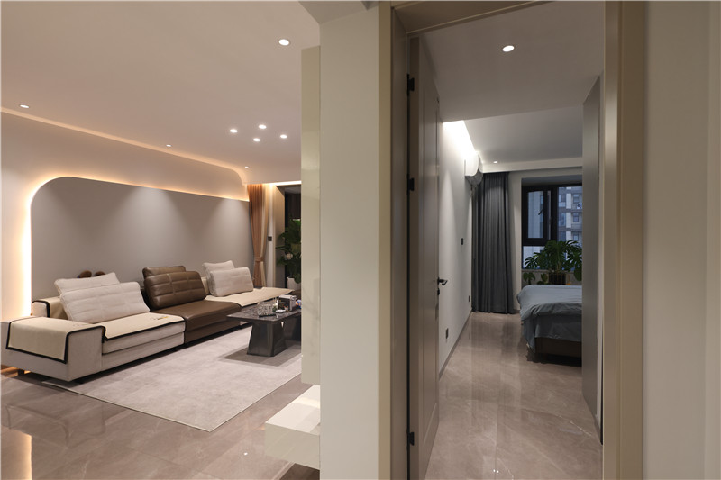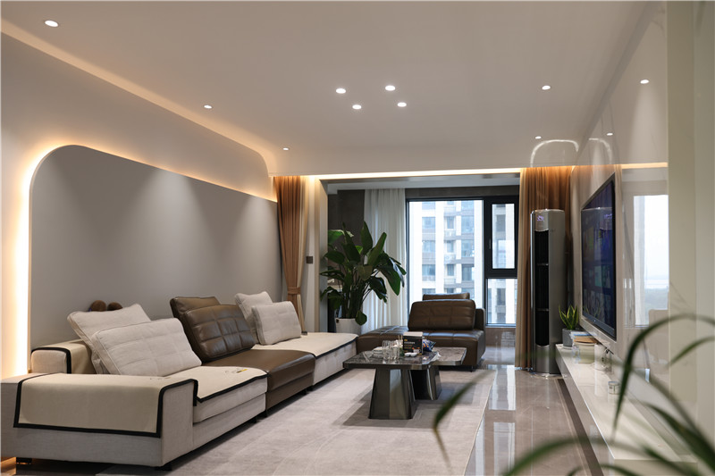 秉承現(xiàn)代簡約的高定思維,以水灰及茶白為基調(diào),用圓弧線條綜合布局,輔之以燈光調(diào)和,讓整體空間自然溫柔,卻暗藏一絲恢弘之意。
