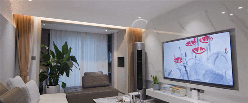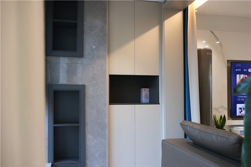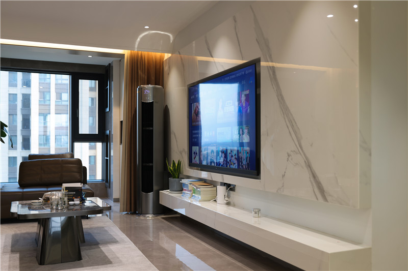 電視背景墻為大理石紋,將電視機(jī)整體嵌入,視覺延展;底柜整面抬高做懸浮設(shè)計(jì),是收納柜,頂部擺上裝飾物不在話下,這立體感也是讓人愛了。
