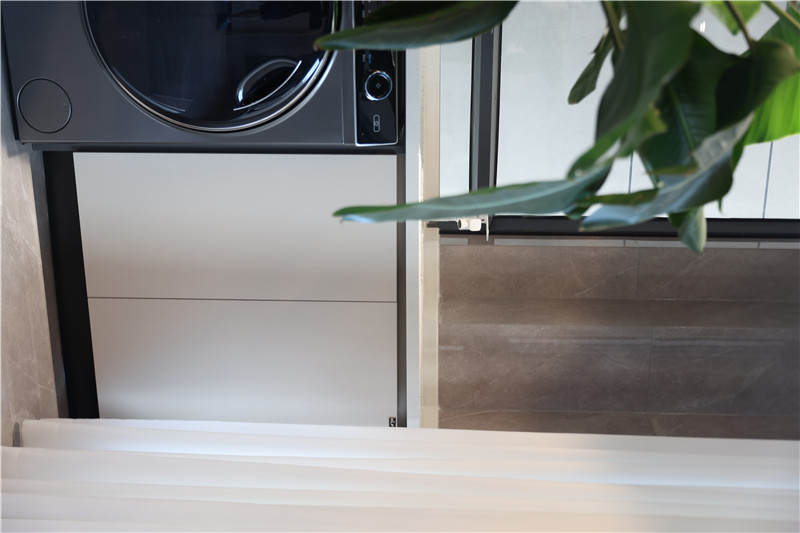 客廳陽臺整面打通,增強(qiáng)空間通透性。陽臺做一個小型到頂柜,中部掏空以深色系入底增強(qiáng)視覺沖擊力;整體無拉手設(shè)計(jì),干凈利落;中央的靈活區(qū)域,可靜思品茶,亦可三兩好久小酌,以窗簾為壁安享一方空間。