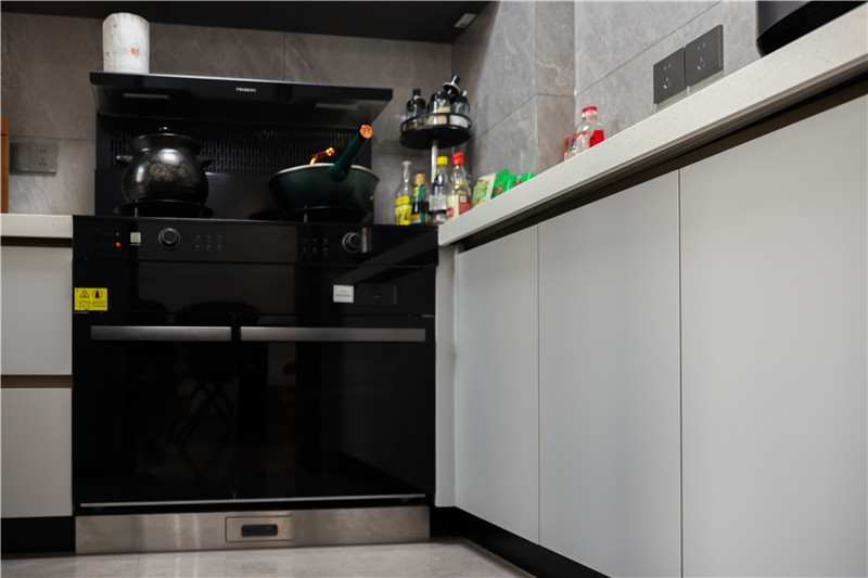 櫥柜貼墻而建,柜與電器組合收納力、實(shí)用性在線;遵循洗→切→烹→盛的動線,提高生活便捷度;臺面巖板,耐刮、防水性能好。
