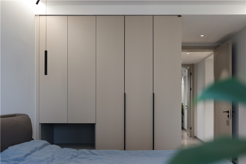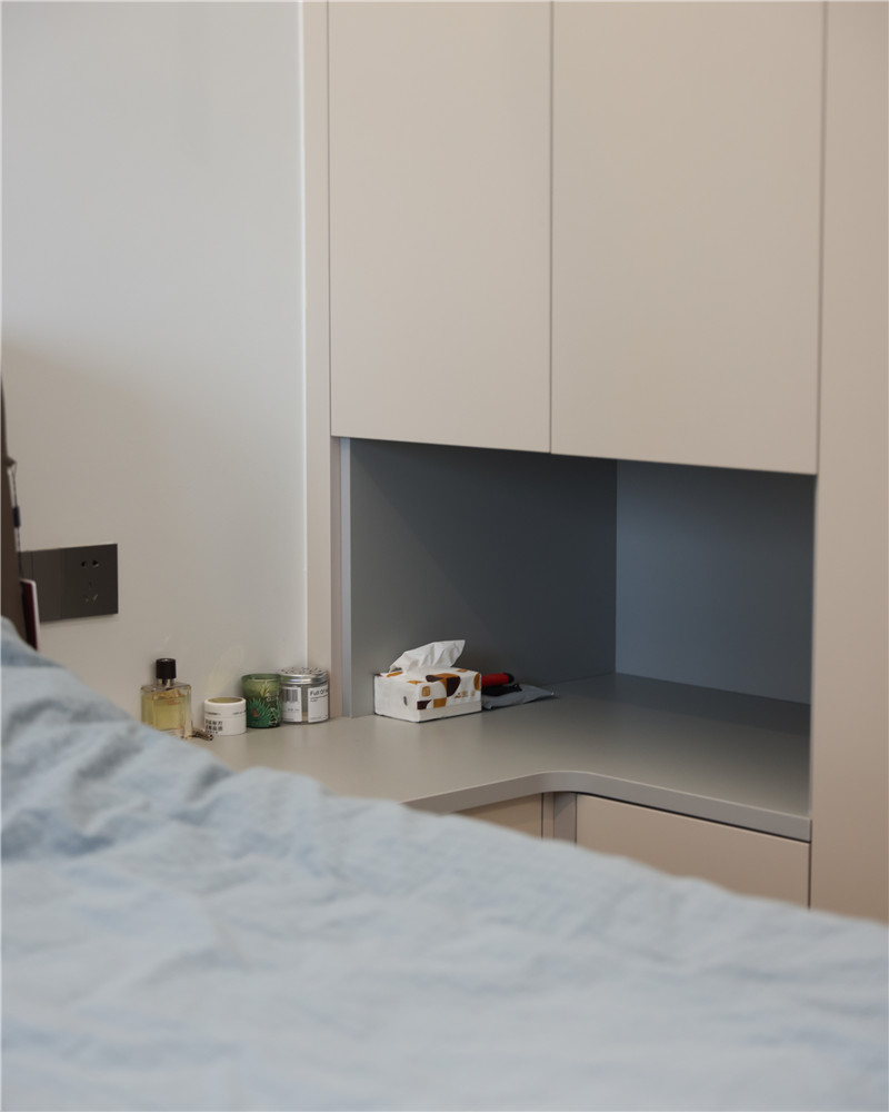 主臥采用無主燈設(shè)計(jì),內(nèi)嵌燈光與射燈營造空間氛圍感;靠窗邊做了一個嵌入柜,不占地方還分散了室內(nèi)的存儲壓力。