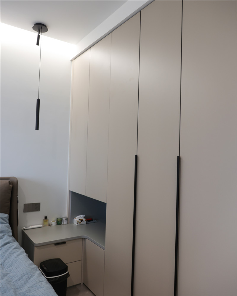 次臥做了一組到頂衣柜,茶白色門板好看好搭;為了節(jié)省空間,設(shè)計(jì)師從柜體中延伸做床頭柜,頗具特色;整體布局簡約大氣,協(xié)調(diào)整體氛圍。