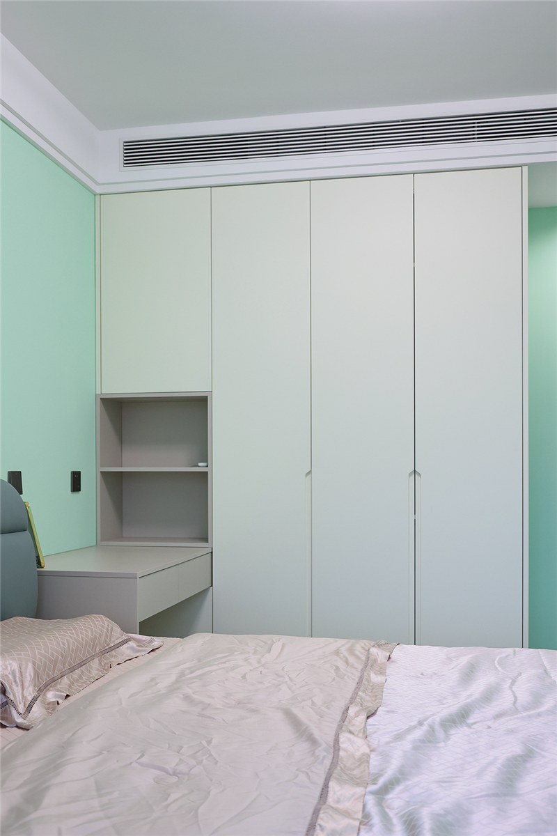一側(cè)到頂式衣柜,延展視覺,搭配銑槽拉手,讓衣柜擁有小亮點;內(nèi)部合理分區(qū),讓小空間的收納力不容小覷;靠窗邊可做小型展覽柜,來個性化裝飾。