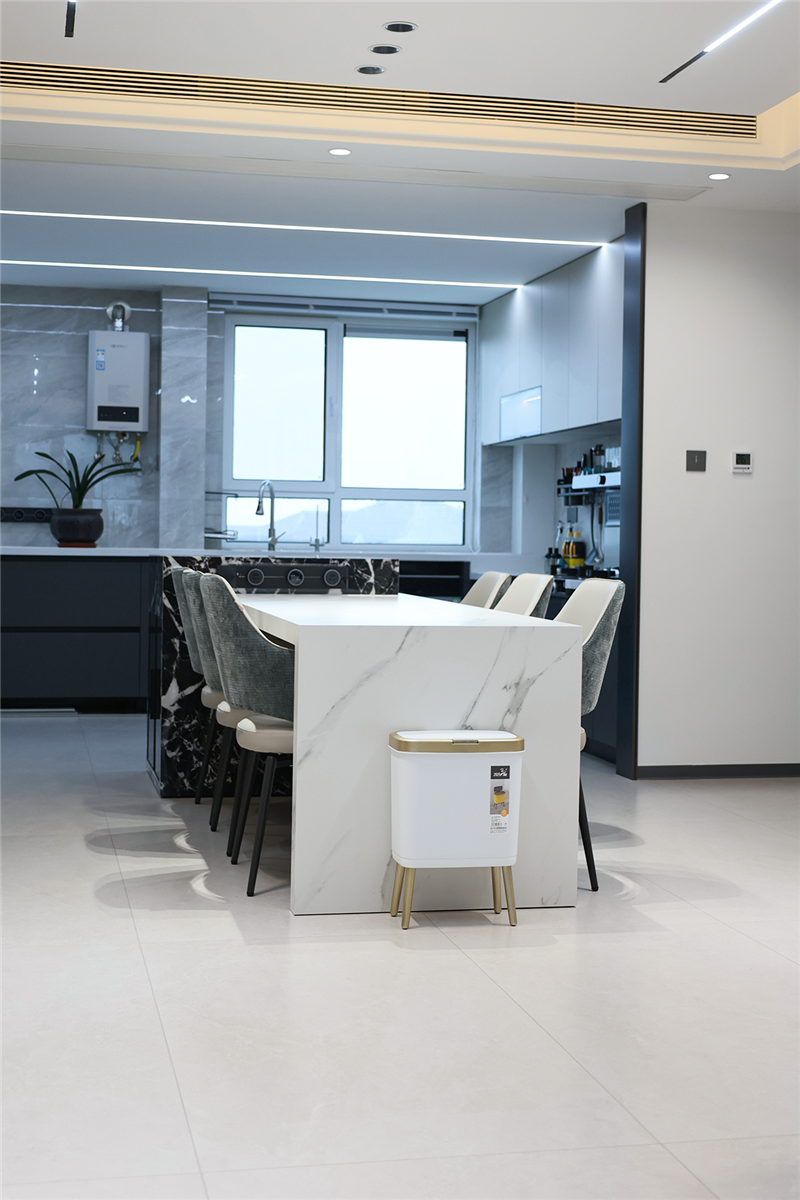 一體化島臺貫穿餐廳與廚房空間,黑白色系與整體空間氛圍相協(xié)調(diào),簡單而不失實用性;整體開放式布局,以智慧動線合理利用空間,也方便家庭成員共同參與其中。