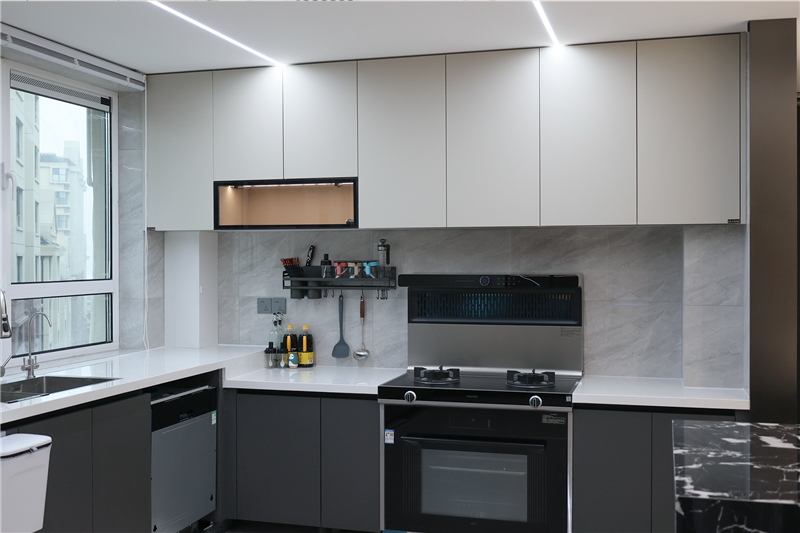 廚房貼墻打造U型深灰色櫥柜,配合茶白頂柜,融入創(chuàng)新水漆工藝,呈現(xiàn)高級美感;常見廚房構(gòu)造,大小戶型都適合;整體光線層次分明,使得空間清晰明朗。