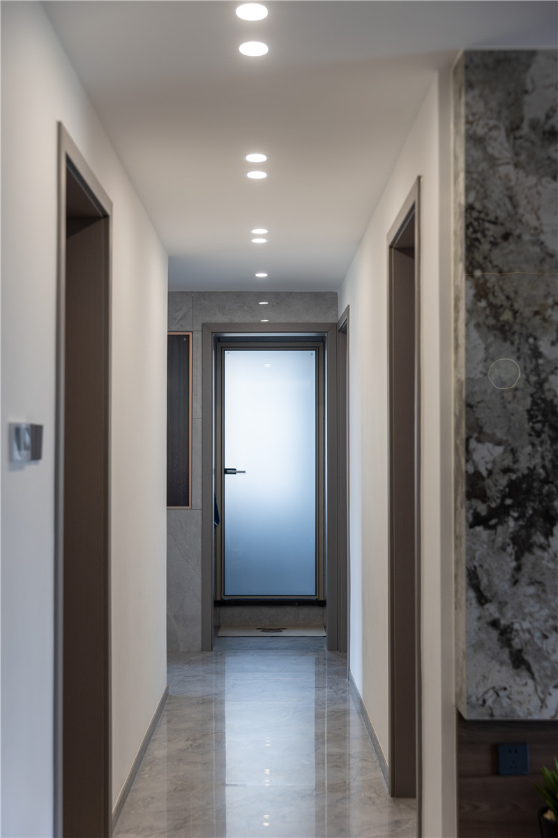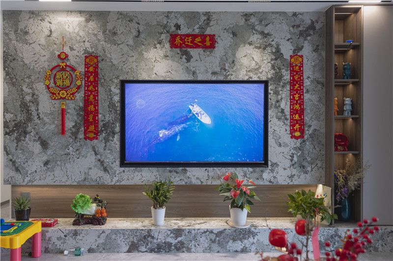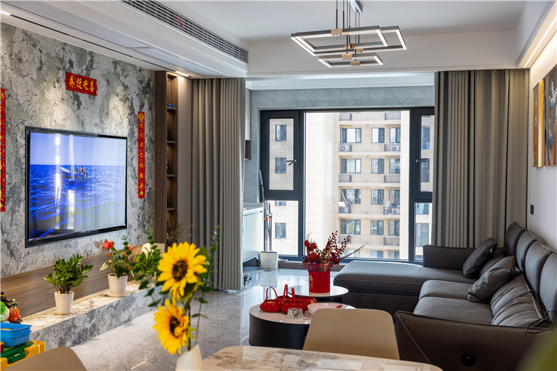 客廳整個打通后進(jìn)行地磚通鋪,延伸了空間視覺感,在客廳的空間設(shè)計上以簡繁結(jié)合的方式,在電視柜背景墻上,以大理石石材進(jìn)行裝飾,為全屋帶去更多的冷感。