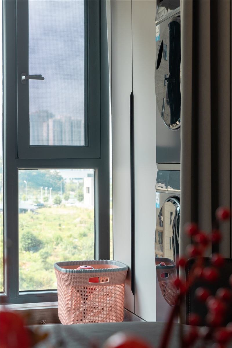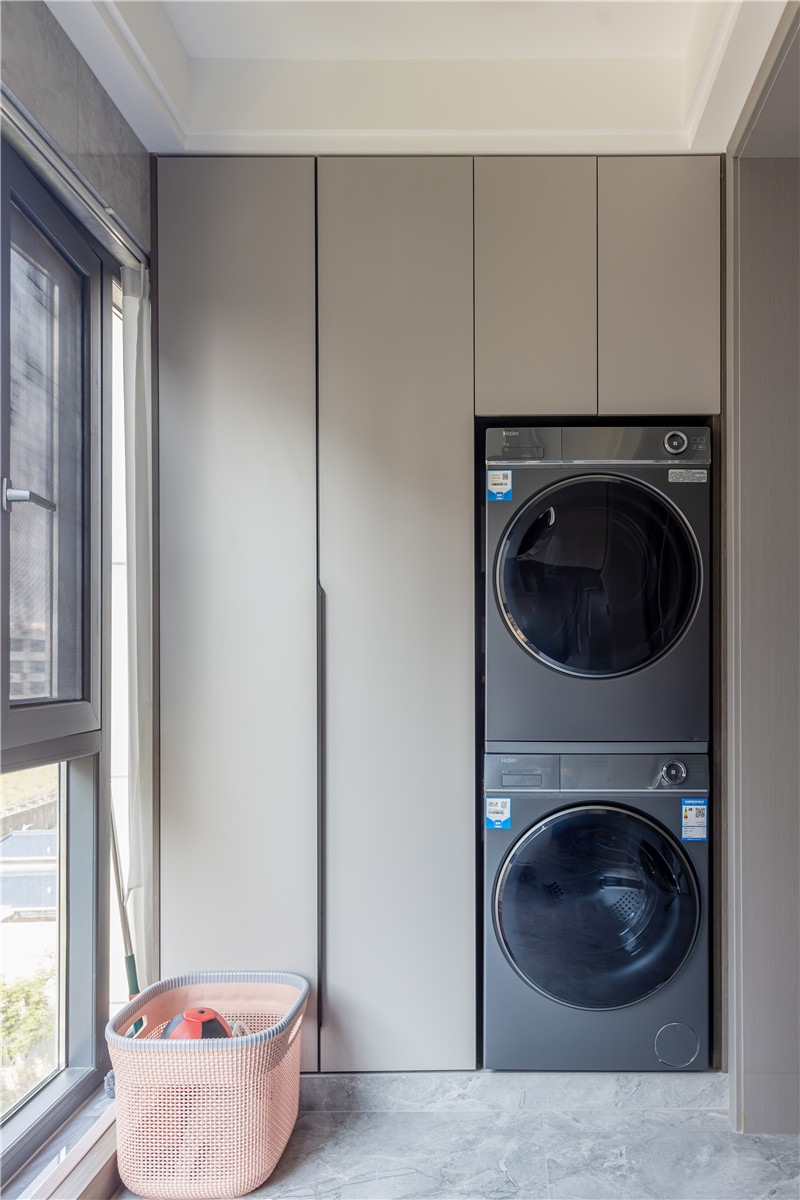 在這戶案例中,收納需求和居住的舒適性是屋主所追求的。所以在陽臺空間上,屋主與設(shè)計師也通過兩組柜子讓家變得更干凈。一側(cè)做家政柜嵌入洗烘家電,到頂高柜內(nèi)部分區(qū)合理,很實用。