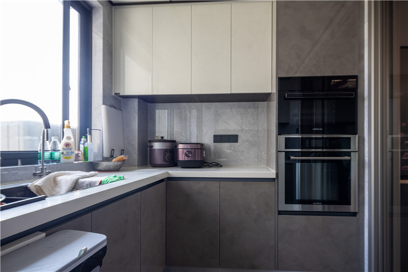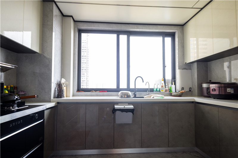 U型結(jié)構(gòu)的廚房設(shè)計更注重物品的收納,這種常規(guī)的吊柜+地柜的多重儲物空間,正是能促成有序整潔的環(huán)境。吊柜采用伊麗莎白,亮面材質(zhì)也很容易清潔。