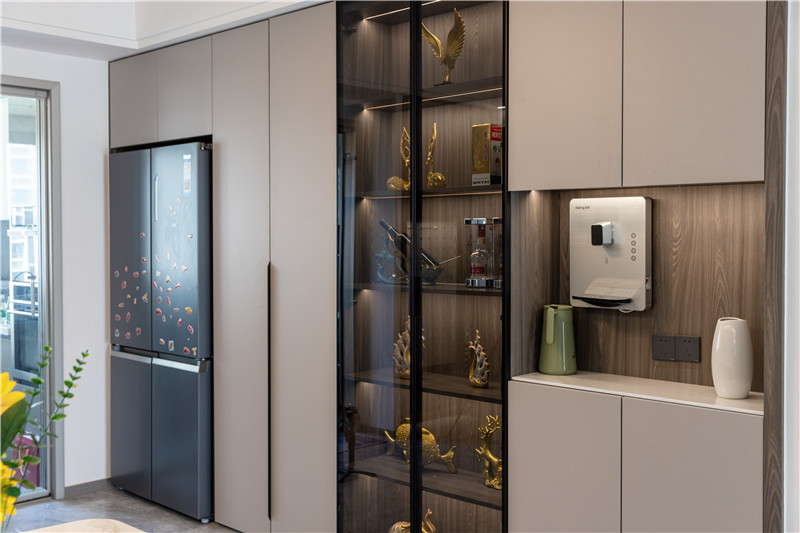 餐邊柜留出冰箱位置做一體化設(shè)計,中部做半透茶玻用于展示藏酒與擺件,側(cè)邊柜中部掏空做置物臺可以放置小家電和生活物品。整體餐邊柜的設(shè)計功能性很高,在實用的同時注重各分區(qū)的比例,給人更精致的感覺。