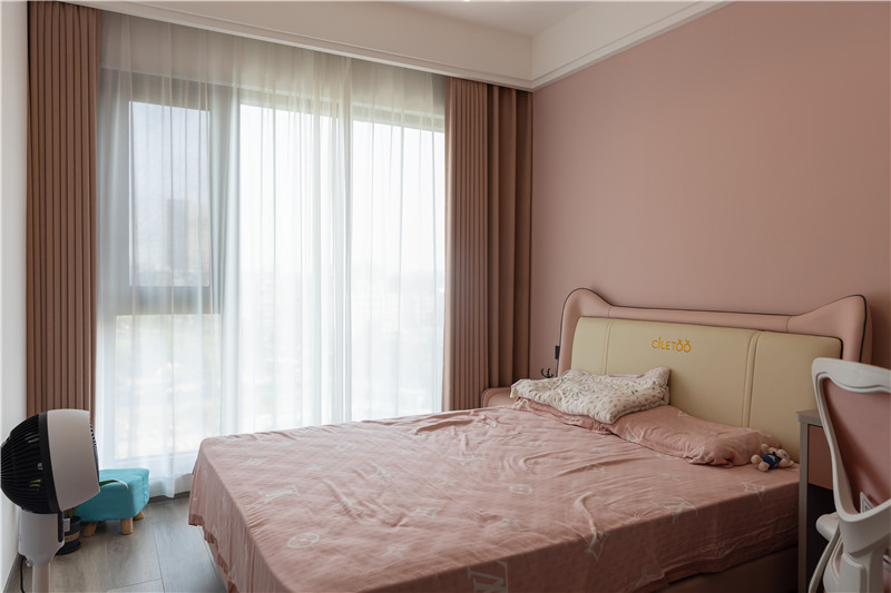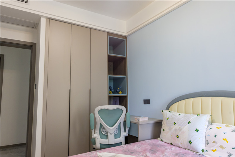 在女兒房的設(shè)計上,屋主以粉色調(diào)和藍(lán)色調(diào)塑造了兩間次臥。在次臥中,除了日常生活的睡眠區(qū),在衣柜設(shè)計中加入了書桌的元素,讓衣柜與書桌一體化設(shè)計,開放格可做書柜使用,整體和諧又節(jié)省空間。