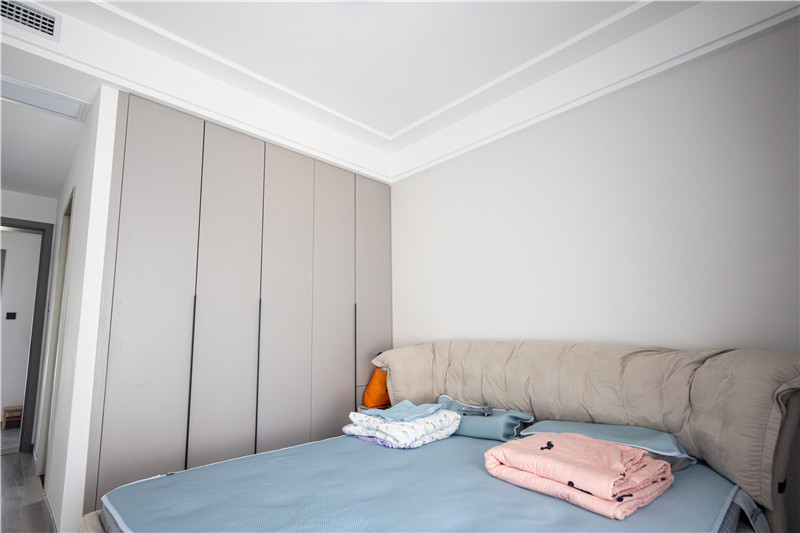 屋主根據(jù)居住者的需求不同,在每個房間的設(shè)計上都有所不同。主臥主要以睡眠區(qū)為主,在靠墻的位置設(shè)計了到頂衣柜,用于收納日常的衣物,整體非常簡潔。