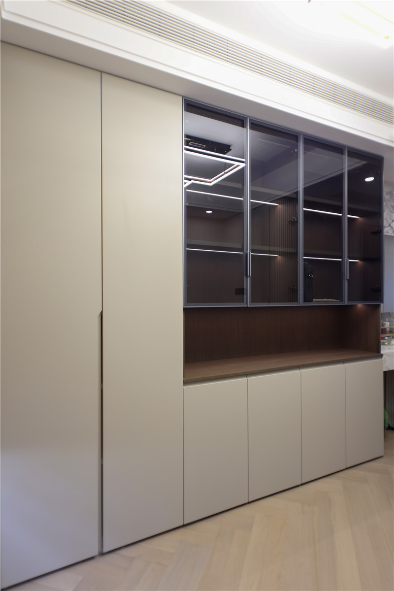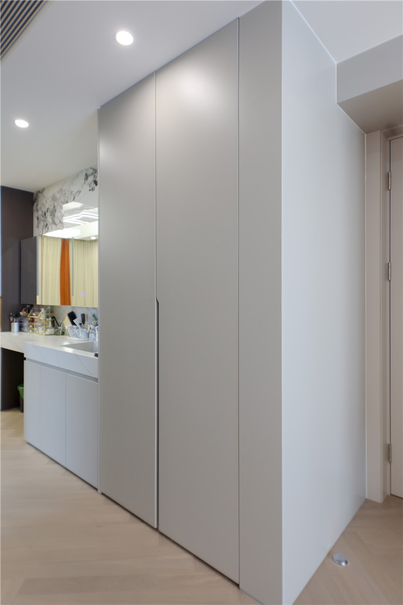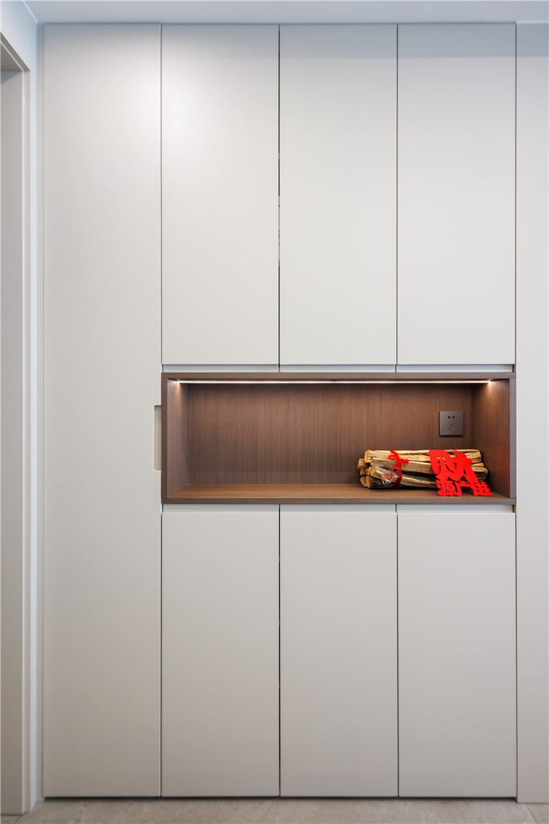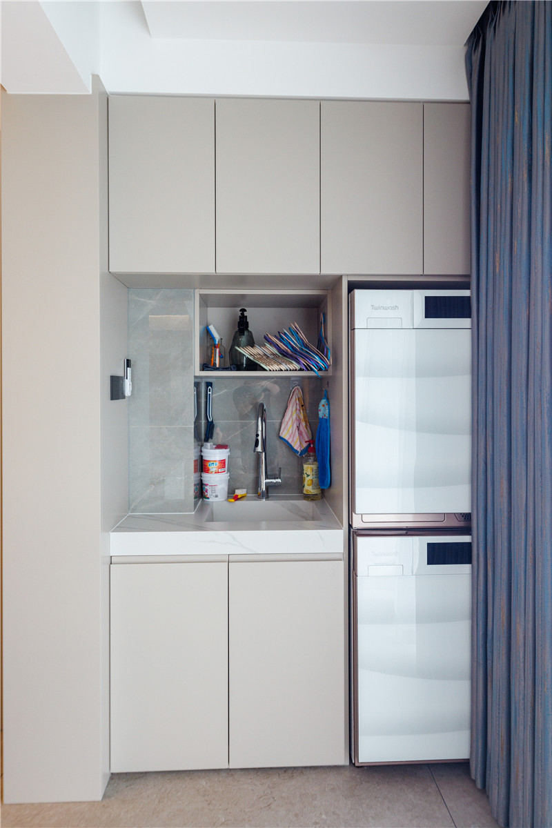 簡(jiǎn)約風(fēng)格的家更注重功能,兩側(cè)陽(yáng)臺(tái)柜一個(gè)做家政柜使用,一個(gè)做洗衣區(qū),分區(qū)明晰,在無(wú)序的生活中以整潔有序帶給家更多美好。